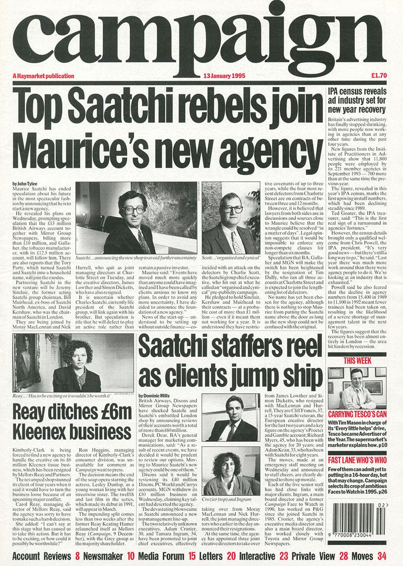 Throughout those years at Teletext, Campaign magazine remained a constant. It was where I learned about new technology, about who was shaping the industry, about which agencies were winning and why. I’d study the front pages, watching them evolve from that classic shot you always used to see: four men in suits, photographed from below at the bottom of a staircase, looking like they were about to announce a hostile takeover of a mid-range accountancy firm.