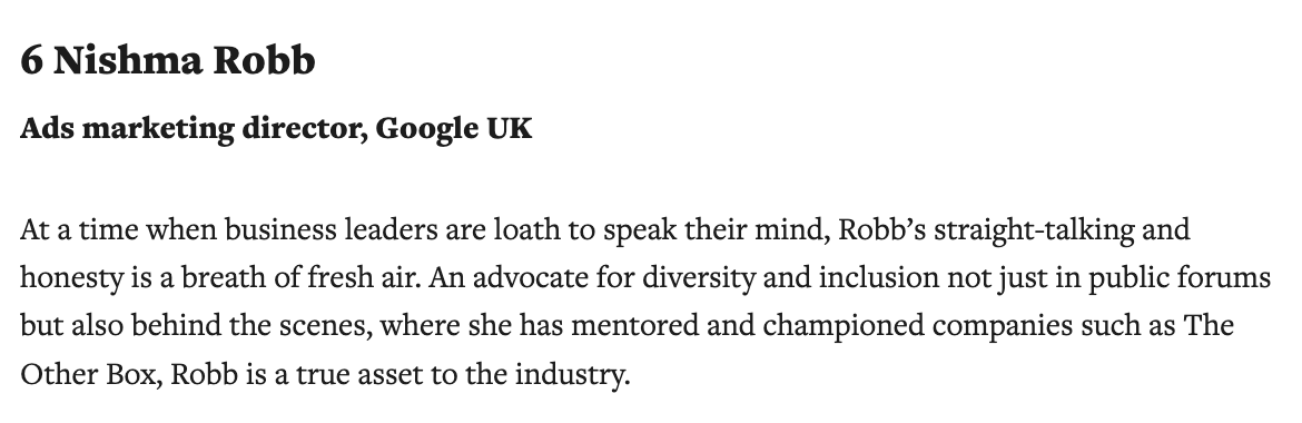 Over my years at Google, I made Campaign’s top ten trailblazers list a few times. The marketing Power List and Hall of Fame (and even made it onto cover!).